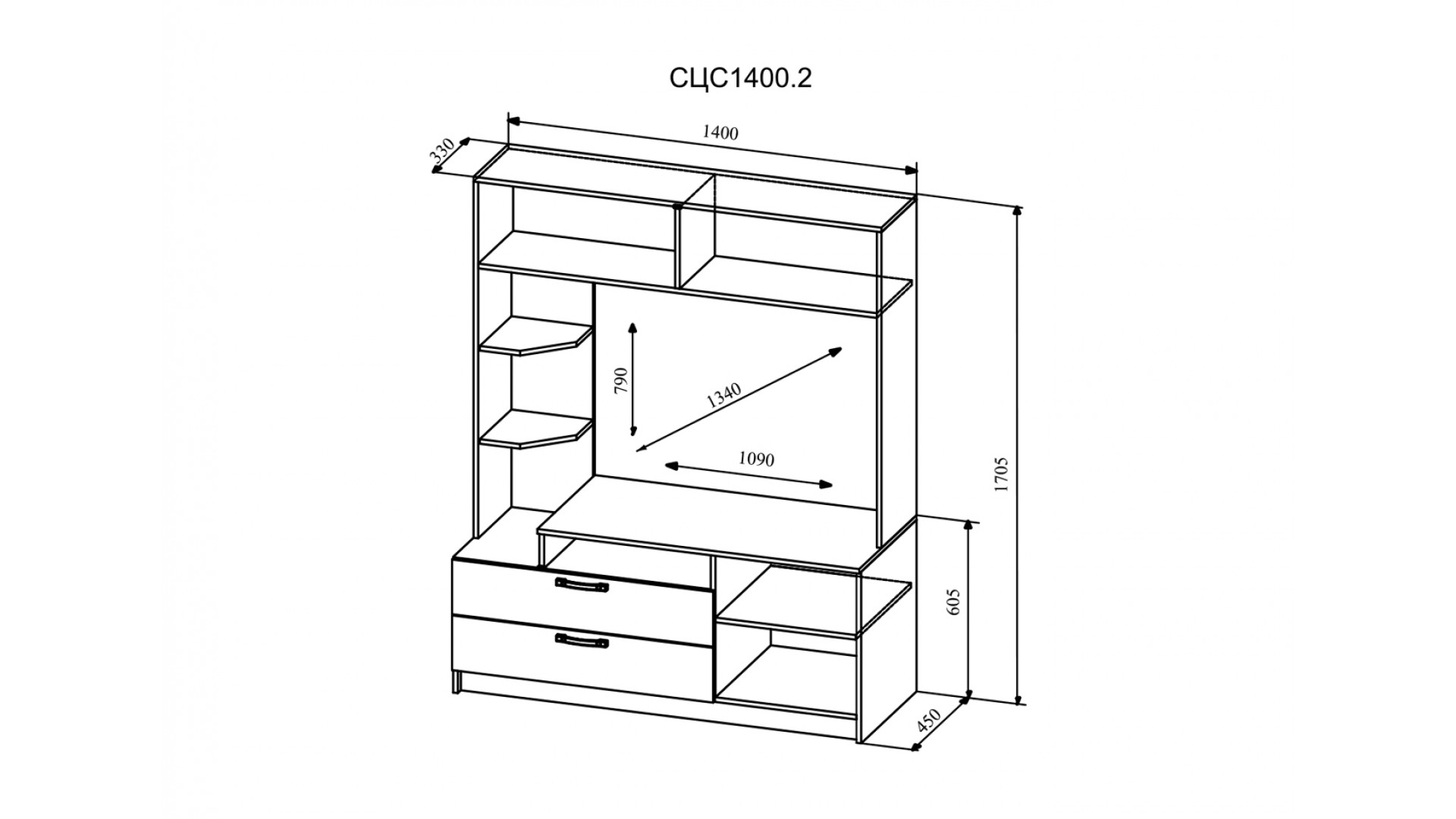 Высота: 1705 мм / Ширина: 1400 мм / Глубина: 450 мм
